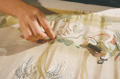 过去皇家的专属用品现如今走进了博物馆。洛阳博物馆正在展出王丽敏的“梵羽御璗——雀金绣文化艺术展”,精妙绝伦的作品展现了雀金绣的发展脉络和文化内涵。观赏性织绣一直是针分翰墨线夺丹青的珍品,比肩文人书画,王丽敏历时八年创作的《蓬莱仙境图》原稿为清代画家创作的绢本设色画,变成雀金绣作品后不仅表现出原作气吞山河的宏伟,而且通过配色使之更为深沉典雅。还有一些作品,观众观赏后惊叹于其中扑面而来的现代气息。王丽敏说:“我们除了在刺绣架前严谨创作,其他时间做事都不那么一本正经。”团队热衷于各种充满奇思妙想的尝试,为传统刺绣注入灵感。工作坊里,曾有绣娘因操作失误藏起“败笔”,却意外打破了固有的创作模式,在不完美中收获惊喜。通过尝试将不同材质与金丝搭配,她创作出一系列风格独特、极具艺术价值的作品。2024年,王丽敏享受国务院政府特殊津贴。